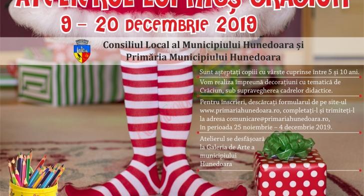Primăria Municipiului Hunedoara organizează cea de-a VII-a ediție a „Atelierului lui Moș Crăciun - atelier de creație pentru copii”! Acesta se va desfășura în perioada 18-20 decembrie 2024 la Galeria de Arte din municipiul Hunedoara. Vor participa grupuri de copii cu vârsta între 5 și 10 ani. Cei mici vor crea ornamente de Crăciun.