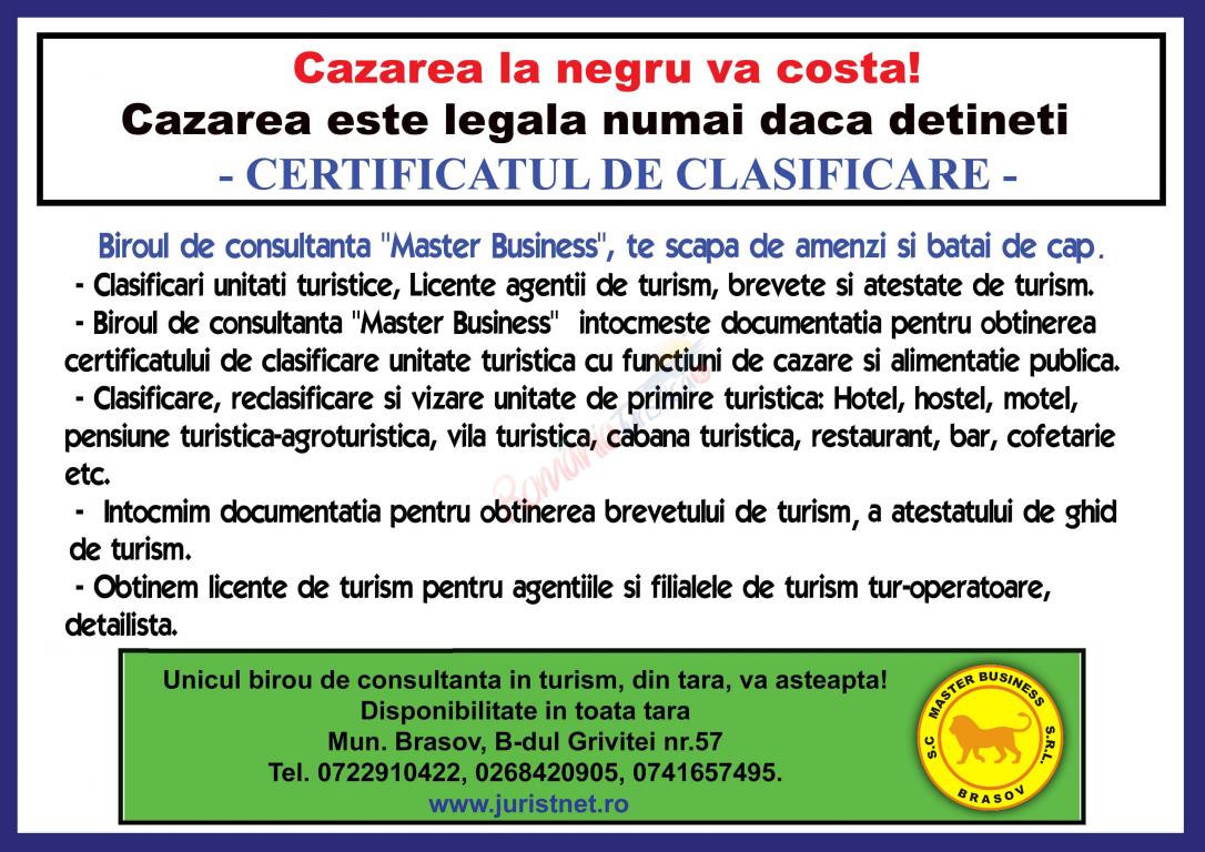 În perioada 24 - 30 iulie 2015, Biroul de Consultanță Master Business by partener România Turistică, va efectua o deplasare în stațiunile de pe litoral în vederea sprijinirii antreprenorilor de pe litoralul românesc, privind autorizarea unităților de primire turistice cu funcțiuni de cazare, alimentație publică, operatori de plaje etc.
