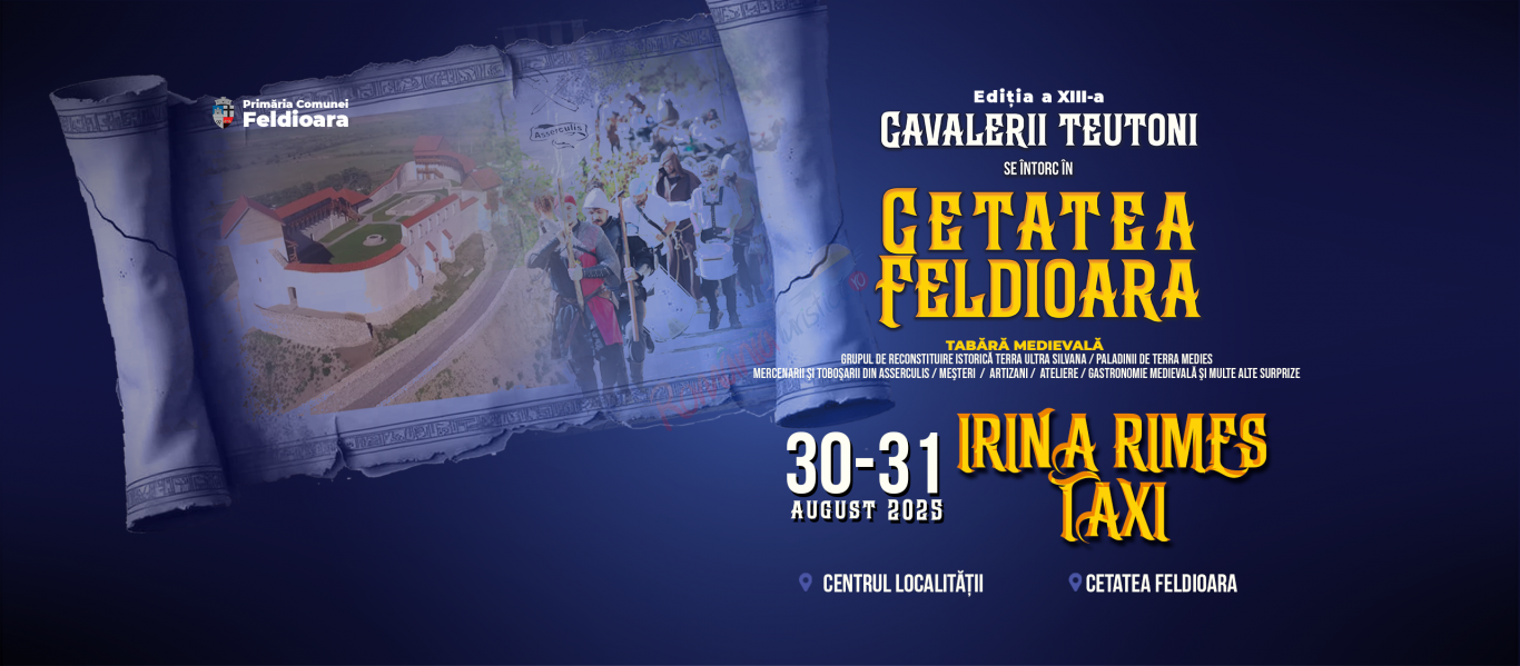 În perioada 30–31 august 2025, sunteţi invitaţi la Feldioara pentru a lua parte la sărbătoarea localităţii celebrată într-un eveniment cu tradiţie - Festivalul “Cavalerii Teutoni se ȋntorc ȋn Cetatea Feldioara”, aflat la cea de-a XII-a ediţie.