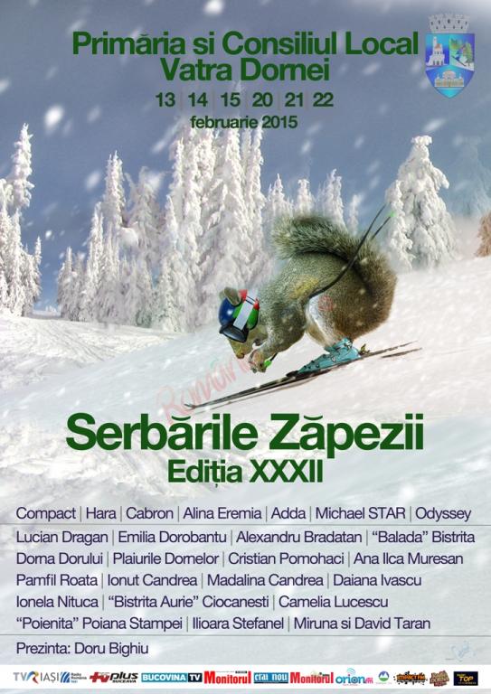 Vă putem anunţa că s-a stabilit programul pentru ediţia din acest an a Serbărilor Zăpezii, Vatra Dorna, ediţia a XXXII-a. În perioada 13 Februarie - 01 martie 2015, Primăria şi Consiliul Local Vatra Dornei organizează o nouă ediţie a “Serbărilor Zăpezii”, manifestare care se va desfăşura trei weekend-uri consecutive, scena urmând să fie amplasată între Cazinou şi Izvorul Sentinela.