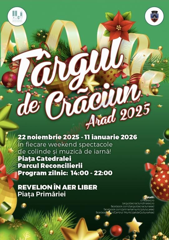 Târgul de Crăciun din Arad, ediția 2025 va fi deschis din 22 noiembrie până în 11 ianuarie 2026, iar organizatorii, Primăria Municipiului Arad și Centrul Municipal de Cultură Arad, vor respecta toate măsurile sanitare în vigoare.