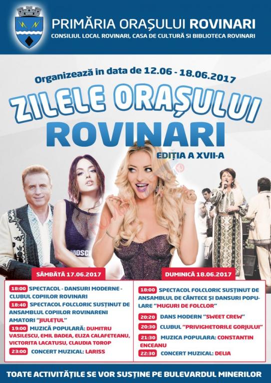 Sfârşitul de săptămână va aduce în faţa publicului nume de top ale scenei muzicale româneşti. Sâmbătă, începând cu ora 18:00, copiii rovinăreni vor deschide seara cu un spectacol folcloric. Începând cu ora 19:00, vor urca pe scenă interpreti de seama ai muzicii populare: Dumitru Vasilescu, Emil Badea, Eliza Calafeteanu, Victorita Lacatusu, Claudia Torop dar si interpreta de muzica usoara Lariss. Duminica, incepând cu ora 18:00, program folcloric si dansuri moderne. Incepând cu ora 21:30, va urca pe scena din orașul Rovinari, Constantin Enceanu, urmat de un megashow oferit de Delia.