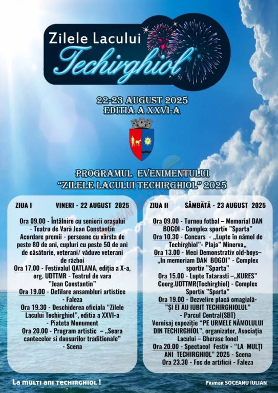 Timp de două zile, Techirghiolul va răsuna de muzică, dansuri, voie bună și evenimente pentru toate vârstele. De la întâlnirile cu seniorii orașului, festivaluri gastronomice și parade ale ansamblurilor folclorice, până la competiții sportive spectaculoase și lupte tradiționale tătărești, programul ediției 2025 este construit pentru a aduce comunitatea împreună și pentru a celebra unicitatea orașului.